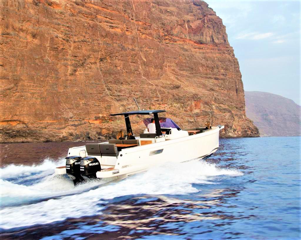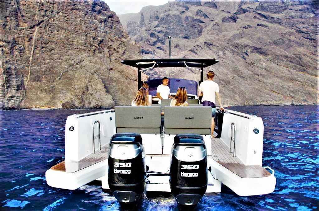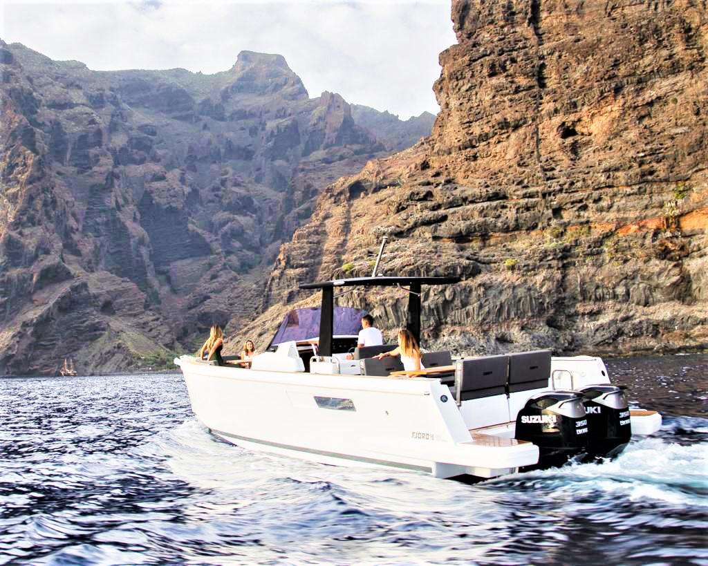 Departing from Puerto Colón, Costa Adeje, the Fjord 36 Xpress takes you to idyllic bays like El Puertito and Diego Hernández, or on a longer adventure to the majestic Los Gigantes cliffs. Swim, snorkel, and relax while enjoying top-class service, fresh meals, and breathtaking views.